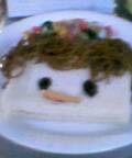 しょくぱんで顔の部分、やきそばで髪の毛 ウインナーの角、レーズンおめめ、プリッツの口。 ほんと、給食の先生には頭が下がります。