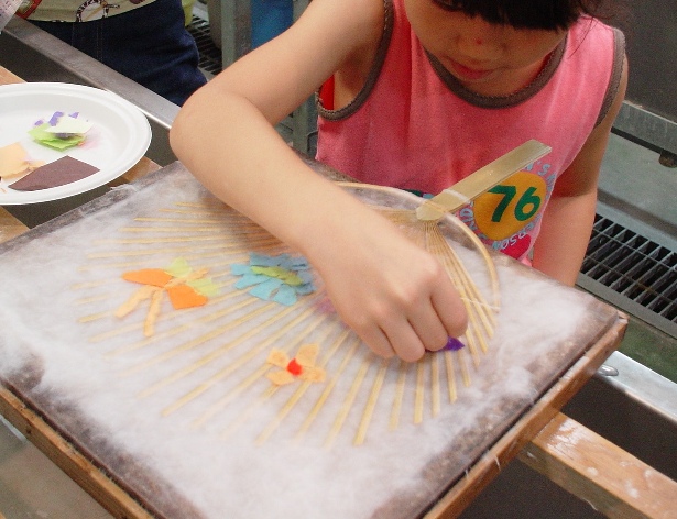 紙すきをして、それに団扇のホネをおいて、また紙すきをし