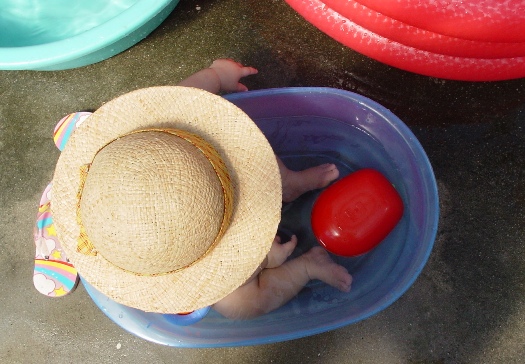 朝、あずさ再来。 子どもたちが再集合したので、車庫にビニールプールを出しました。 さすがに小学生2人には小さいので、大きなたらいも出してバシャバシャ。 ついでに小さいたらいも出して、長女ちゃんも初プール。