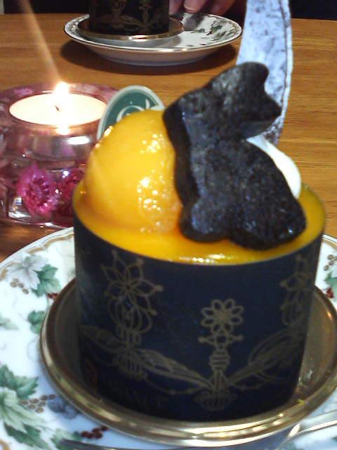 お月様のようなマンゴーにチョコクッキーのうさぎがのってます。