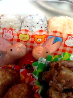 からあげ、ポテト何とか(冷凍) そしてそして・・・ ウサギさん型ウインナー!!!! 目は黒ゴマです。 おかーちゃん、がんばった。