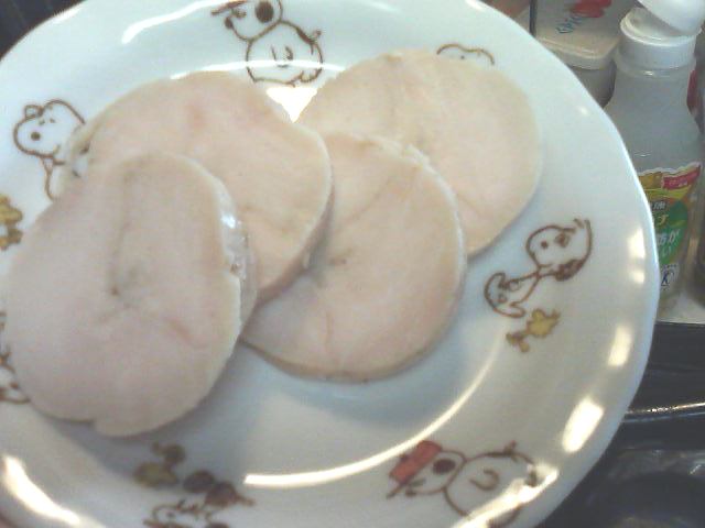 バナナっぽいですが、鶏ハムです。 糸でぐるぐると巻いたのでまーるく出来ました。 ネットで何かの折にふと発見したレシピなのですが 簡単に作れて、おいしい。 テレビか何かで紹介されて結構有名なレシピの様子。