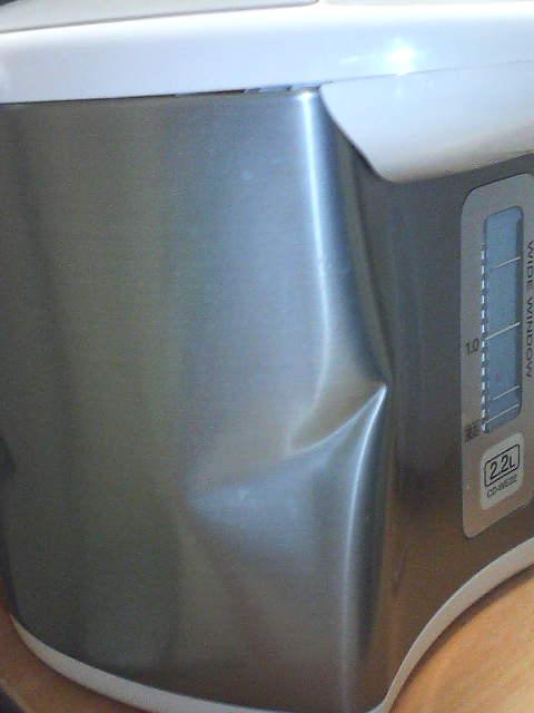 すぐ下にあった、アルミ製のゴミ箱にぶつかったので、結構なへこみ具合。 なぜすぐ気がつかなかったのか・・・。 機能にはまったく問題ないようなので、これからもお世話になります。
