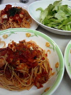 ホールトマトと冷凍シーフードでシーフードトマトソーススパゲッティー。