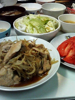 鶏肉ともやしのしょうが焼き トマトサラダ キャベツうまたれ 白菜の味噌汁